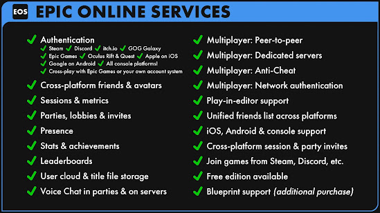 Use Epic Online Services in Unreal Engine! With support for authentication, avatars, friends, sessions, parties, Voice Chat, presence, stats, achievements, leaderboards, Player Data Storage, Title Storage, peer-to-peer networking, Anti-Cheat, and network authentication, this plugin has what you need to build games on top of EOS.